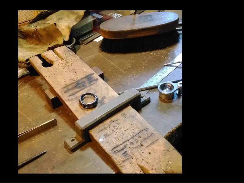 作業風景。 WORK 2016.05.012024.12.23 指輪のサイズを直します。正面にはジルコニアが三つありますので、まずはそれを外します。 糸鋸で余分な腕をカットして、バーナーでロウ付けして繋ぎ直し。 再燻しをして石を留めて仕上げ直したら、サイズ縮め完了です。