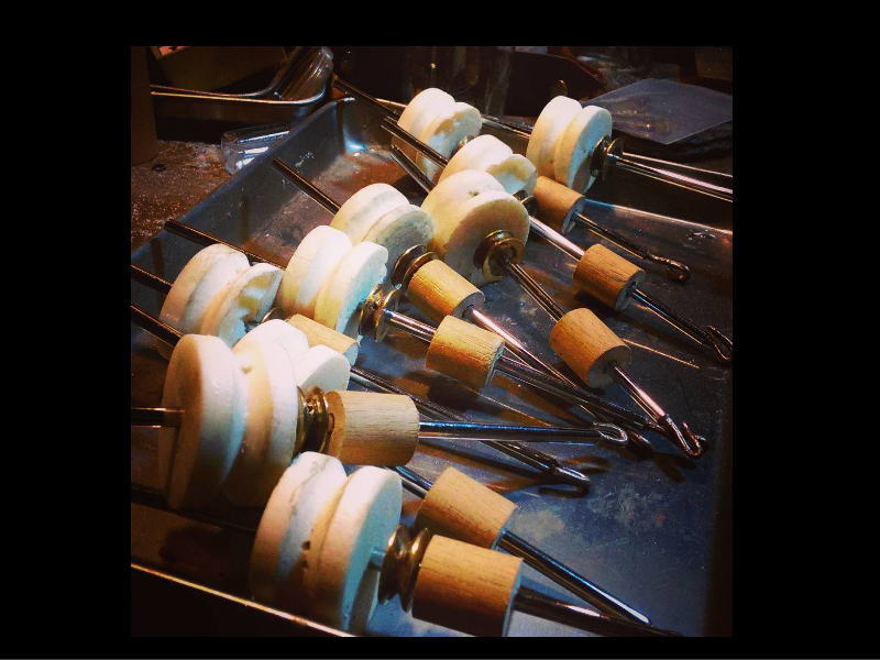 軸はこぼれ止め、白いのは型取りしてレジンで量産、下の小さいのは同じく型取りして真鍮で量産、その下にあるのは木の丸棒をカットしたもの。