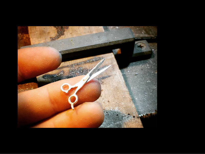 この小さな銀のハサミはちゃんと紙を切れるのです。ジッポケースにロウ付けすると動かなくなってしまいますけど、こんなことできますよ。という、誰得か分からない遊び。
