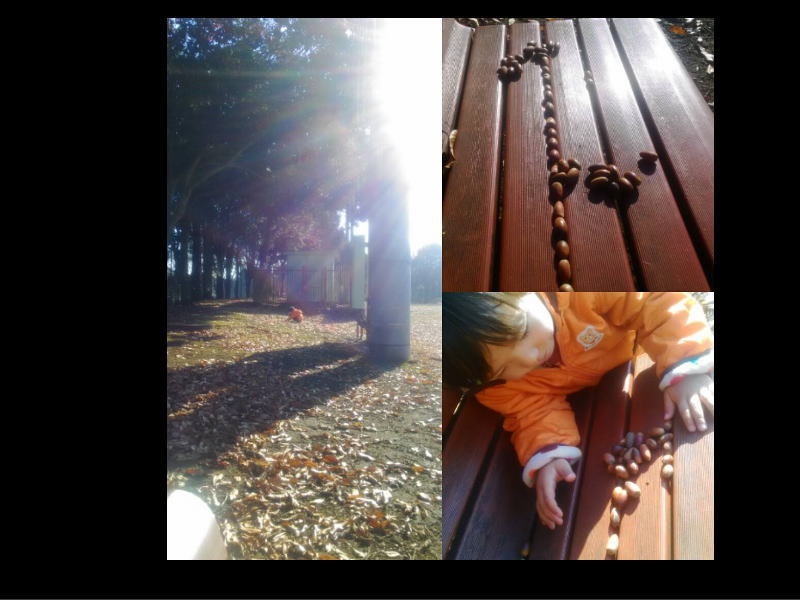 自分はドングリがベンチの溝に一列に並べられている様子を見ていました。