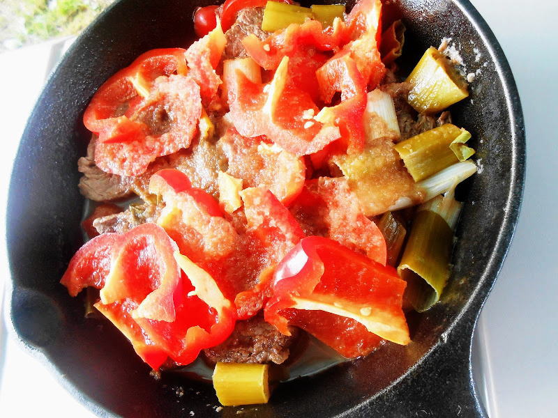 漕いだ後は木陰にタープを張って、パプリカたっぷり&ステーキ肉をスキレットで調理。