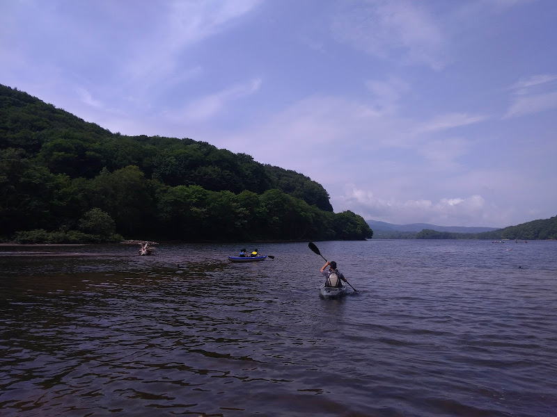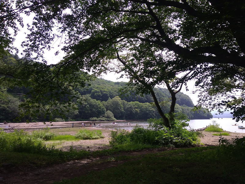 たくさんの人が湖水浴をしたりSUPやカヤックで小野川湖を楽しんでいます。