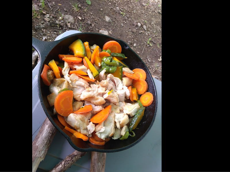 適当に持ってきた野菜と肉をスキレットに入れたら、無水調理。味付けはその時々でやっぱり適当です。美味しければ良いのでこだわりはありません。