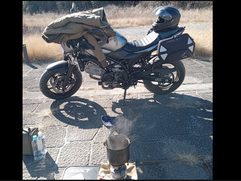 河川敷の隅にバイクを止めて、フェザーストーブでお湯を沸かしてインスタントラーメンを作って、本を読みながらのんびり。