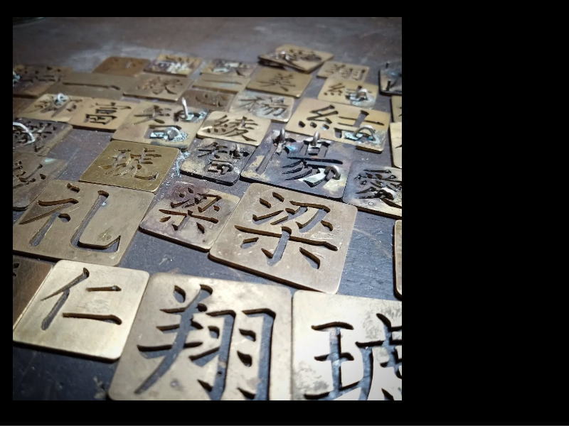 真鍮板から糸鋸で切り出して作ってあり、セミオーダースタイルで依頼品に合わせた応用が利くようにしています。