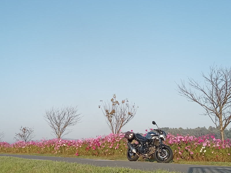 霞ヶ浦の遊歩道沿いにコスモスがたくさん咲いていたので、バイクを止めて散歩もしました。