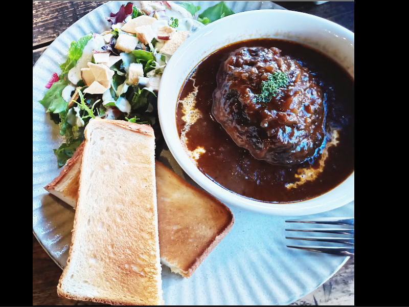 お米を食べない自分はライスをトーストに変えていただいてハンバーグを食べました。