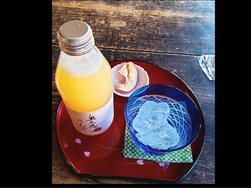 奥久慈りんごジュース。干しリンゴも付いています。気温は高めで店内も暖かいので頼んでみました。これもとても美味しかった。