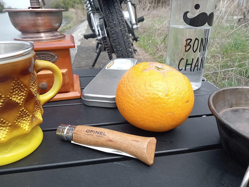 バイクで走っているとほんのり体が冷えましたが、熱いコーヒーで温まり、オレンジで口の中をさっぱりとさせるとすごく気分が良く、川を眺めて和むひと時が最高でした。