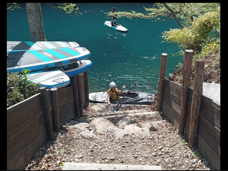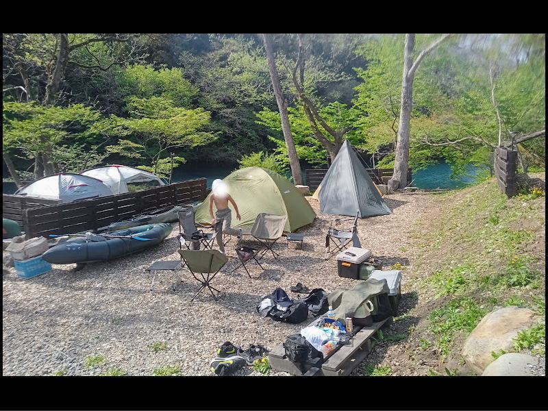 テントサイトから湖が見下ろせるし、出艇場所も同じ敷地ですぐ目の前。写真で見たそのままの青い水がとても綺麗で本当に良いところです。
