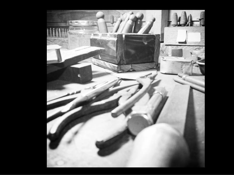 作業中の机の上と道具たち。