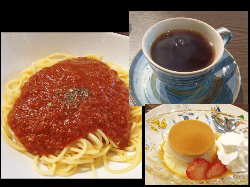 ボロネーゼとプリン、コーヒー。プリンは甘さ控えめで食べやすかったです。