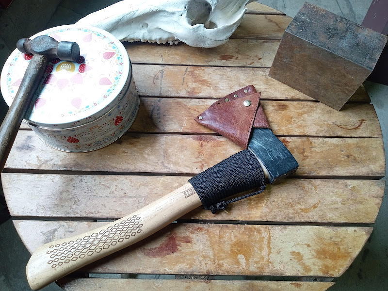 この斧は数年前にもらって子供たちとのキャンプの時などに愛用しておりました。よく見たらネックにダメージ発見。その保護のためにまずコードを巻いて、それからシースのデザインを検討。