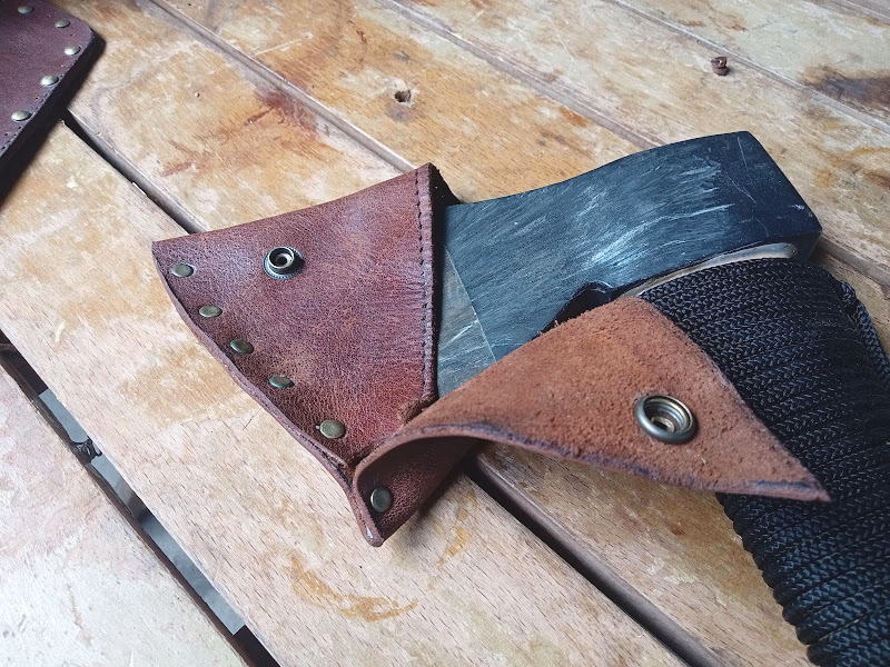 とにかくシンプルなものにしようと紙を適当に斧に巻いてみていろいろと試し、形が決まったところでカット。リベットで留めてホックを付けて完了という、かなり単純なもの。