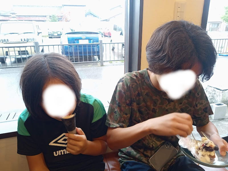 昼食の後にどうしてもブルーベリータルトと美味しいコーヒーを、今日こそはとやってきて、ここのソフトクリームはマジですごい美味しいのですすめて食べさせたら黙りこくって夢中になる三男。