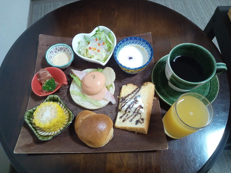 こちら朝食。HPには軽朝食と書いてありますけれど、意外と量があり種類もたくさん。コーヒーとジュースも付いていて美味しい。