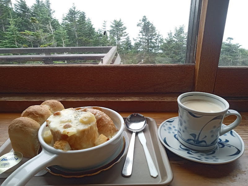 お盆を過ぎていたためか、草津側が通行止めのためかヒュッテは空いていてすぐに食事ができました。リフトで登ってくるときにかなり冷えたのでホットカフェオレとグラタン。温かい食事が身に染みて美味しかったです。