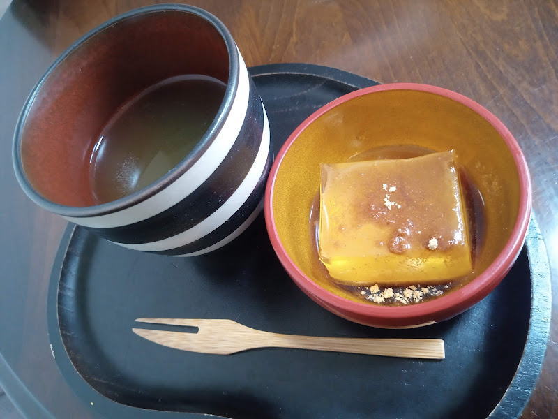 バスターミナルの前に有り、駐車場もすぐ横の湯畑観光駐車場。なので宿から出てすぐ湯畑へ行くことができて、お風呂は源泉掛け流し。ウェルカムスイーツ(画像)とお茶が出て、七組限定、朝食は部屋まで運んでもらえます。