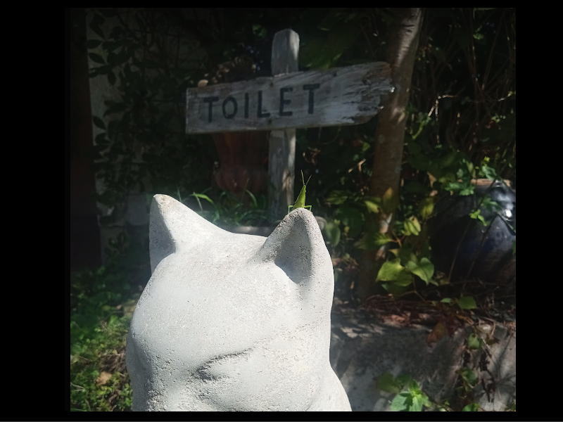 帰る前にちょっとだけ敷地内の写真を撮りました。トイレは外にあるのですが、猫の石像が入り口両脇を守るように置かれていて、その片方の耳の上にバッタ発見。
