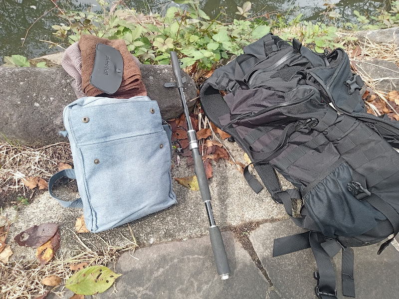 息子たちがもめん茶屋に入ってしばらく時間ができたので、歩いて川へ向かいました。少し前の早朝に釣りに来たとき、釣果がゼロだったのでリベンジです。良さそうなところで持ってきた道具たちを出す。