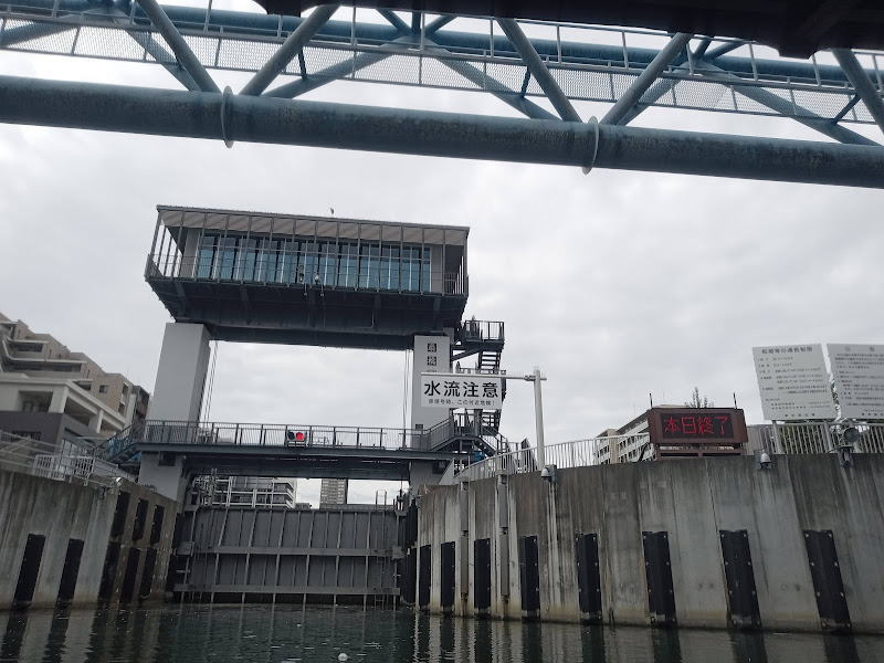 再び小名木川に入って閘門に着いてみたら。。。まさかのお休み。電光掲示板に「本日終了」と出ています。なんてこった。