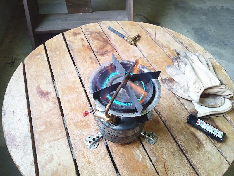 で、組み立ててホワイトガソリンを入れてポンピングしてみました。しっかりと圧力がかかりまして、火を点けてみると。。。