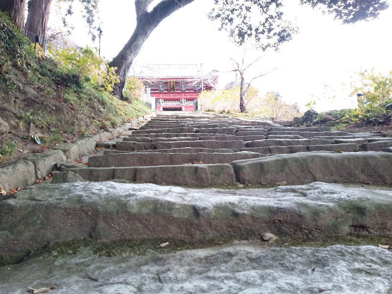 石段がカッコいい。登りきると赤い門があります。