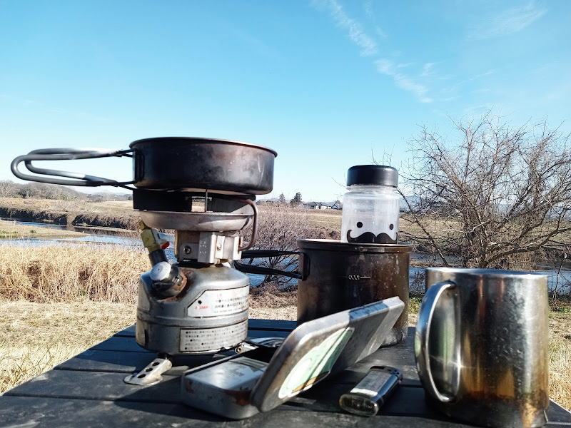 いつもの道具を出して、ここが良いなと決めたところに落ち着いて、冬の空の下で流れる水の音を聴く。熱くしたカフェオレの入ったマグで手も温めながら、対岸で犬と遊んでいる人も眺めたり。