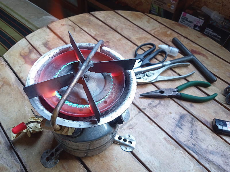 燃料バルブを何度かON・OFFと繰り返すと内部のつまりが取れたようで、さらにしっかりとポンピング。点火するとぼわっという音と共に赤い炎が。